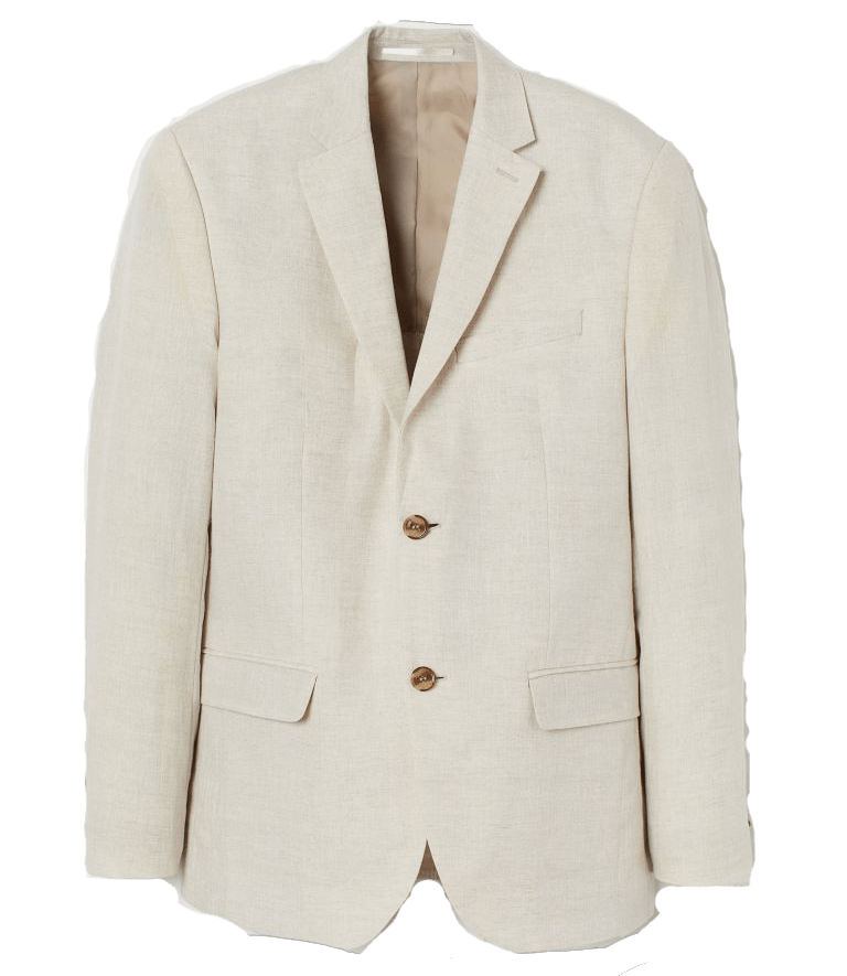 This is the only option on this list that is regular price at under $100. Because of that, you can expect it to be pretty basic but that doesn’t mean there’s anything wrong with it. This particular jacket is closer to a cream color than the Orlebar Brown version, and it has brown tortoiseshell buttons instead of monochromatic ones. But it features a two-button closure, flap pockets, and it’s 100% linen, making it a great budget-friendly option for a summer suit jacket.