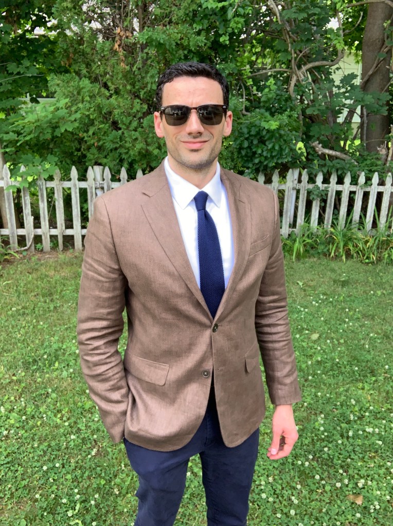 This Baird McNutt blazer checks all the important boxes – dark beige, notch lapels, flap pockets, and linen construction (the product description says linen/polyester, but I don’t know if the polyester is just in the lining or if it’s also part of the blazer). I’m not sure how light this blazer will look in the sunlight but the color does seem a pretty good match based on the web photos. This blazer is also classic fit instead of slim fit, so it’s a good option if you don’t like slim-fit blazers. And, honestly, getting a blazer for under $100 is a great deal.